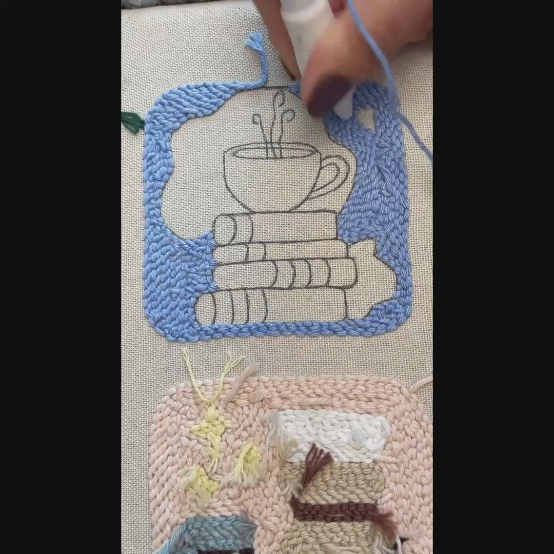 Untersetzer-Vorlage „Bücher und Kaffee“ mit Punch Needle als PDF-Download – Design für Leseecken