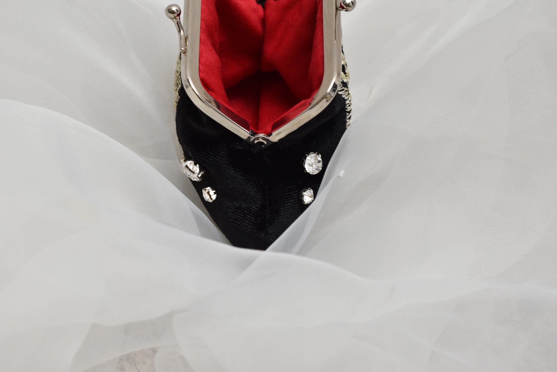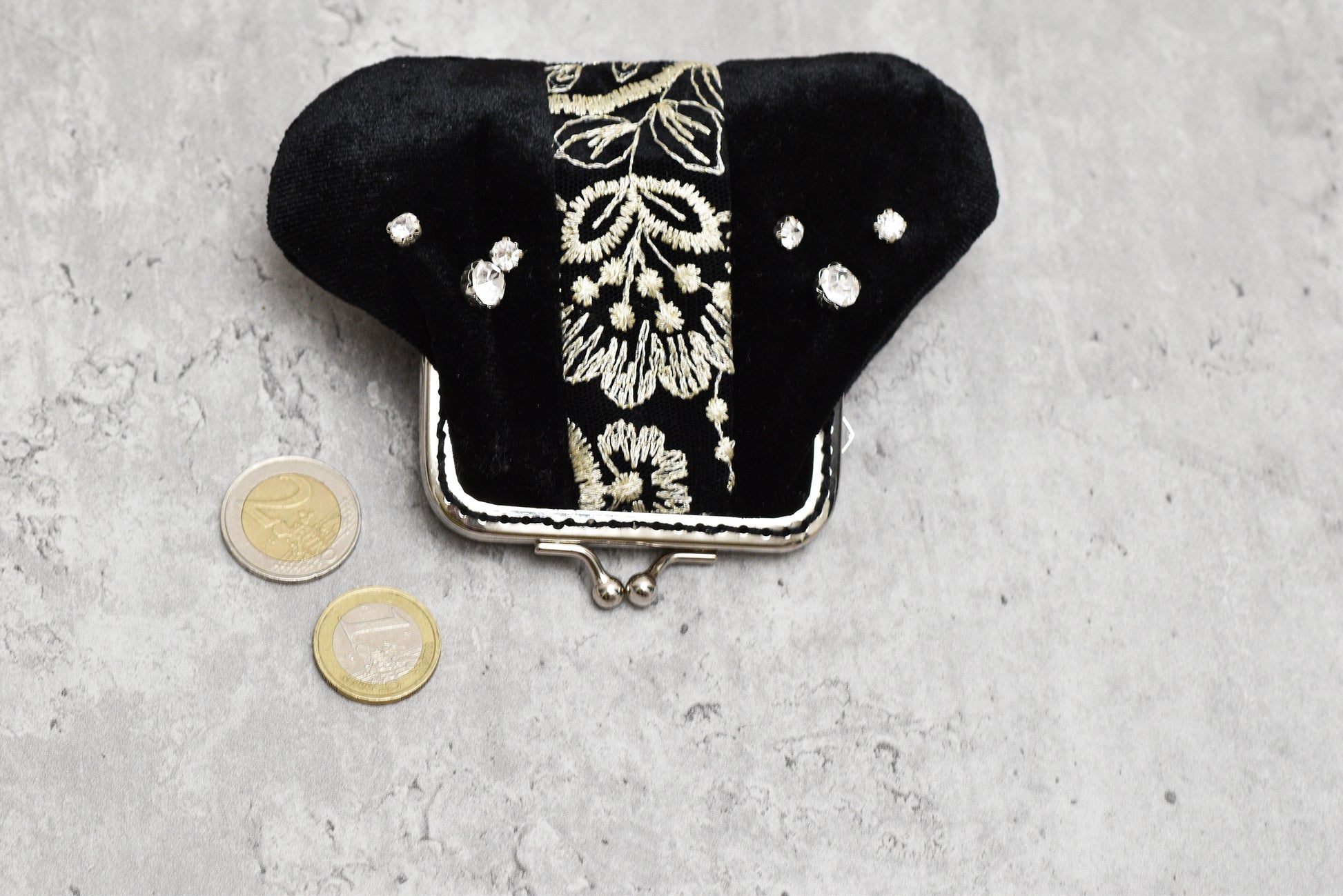 Materials Needed: Velvet, lace, cotton fabric, rhinestones, 7.5 cm (2.95 in) kiss lock frame, textile glue, and basic sewing essentials.