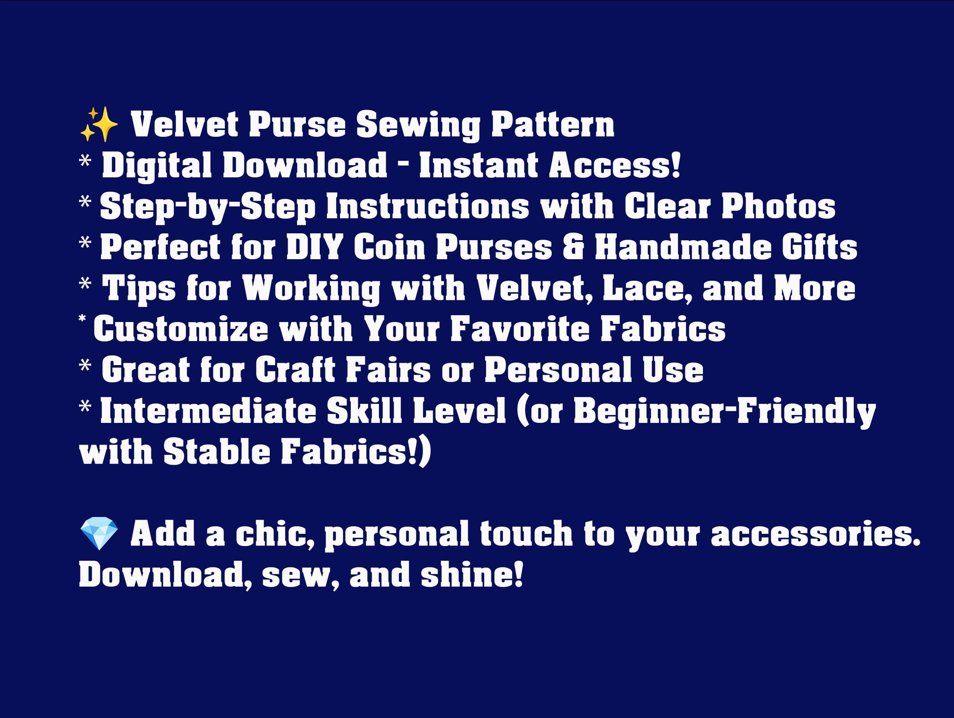 Create your own elegant velvet purse with this easy-to-follow sewing pattern! This digital download includes detailed, step-by-step instructions supported by clear, high-quality photos to guide you through making a chic kiss lock coin purse. While working with velvet and lace can be a bit tricky, with a little patience and the helpful tips included, you'll be on your way to crafting a beautiful accessory.